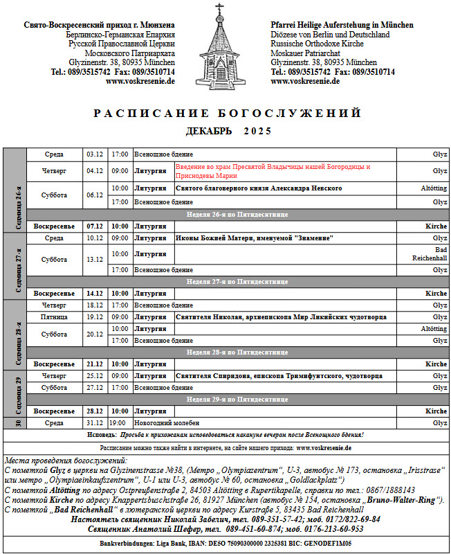 16 марта 2024 года, в субботу сырной седмицы, Собора всех преподобных отцев, в подвиге просиявших, протоиерей Николай Забелич, настоятель Воскресенского прихода гг. Дахау и Мюнхена, совершил Божественную литургию в приходе во имя святых мучениц Веры, Надежды, Любови и матери их Софии в г. Бад Райхенхалль. После отпуста отец Настоятель и сослуживший ему диакон Димитрий Черемных испросили у всех прихожан прощения накануне Великого поста. По окончании Литургии отец Николай обратился к собравшимся с напутствующим словом о значимости предстоящего времени святой Четыредесятницы. После целования креста все прихожане собрались за трапезой, затем состоялся небольшой концерт певчих храма.