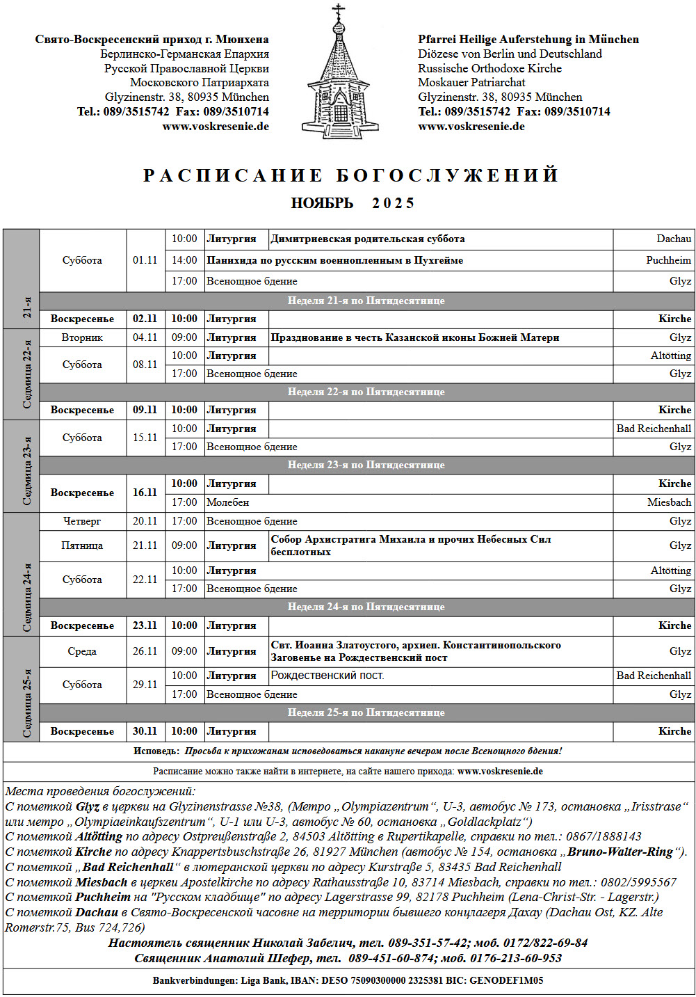 За внесенные пожертвования Вы можете получить специальный документ „Spendenbescheinigung“ о произведенном пожертвовании, который можно приложить к годовому налоговому отчету для снижения налогов. Укажите для этого в строке „Zweck“ (назначение платежа) Ваш адрес с индексом. Для получения более подробной информации о строительстве обращайтесь к настоятелю Свято-Воскресенского прихода отцу Николаю Забеличу +49 172 822 69 84 или к секретарю прихода Матвею Кобро +49 176 220 51 660.