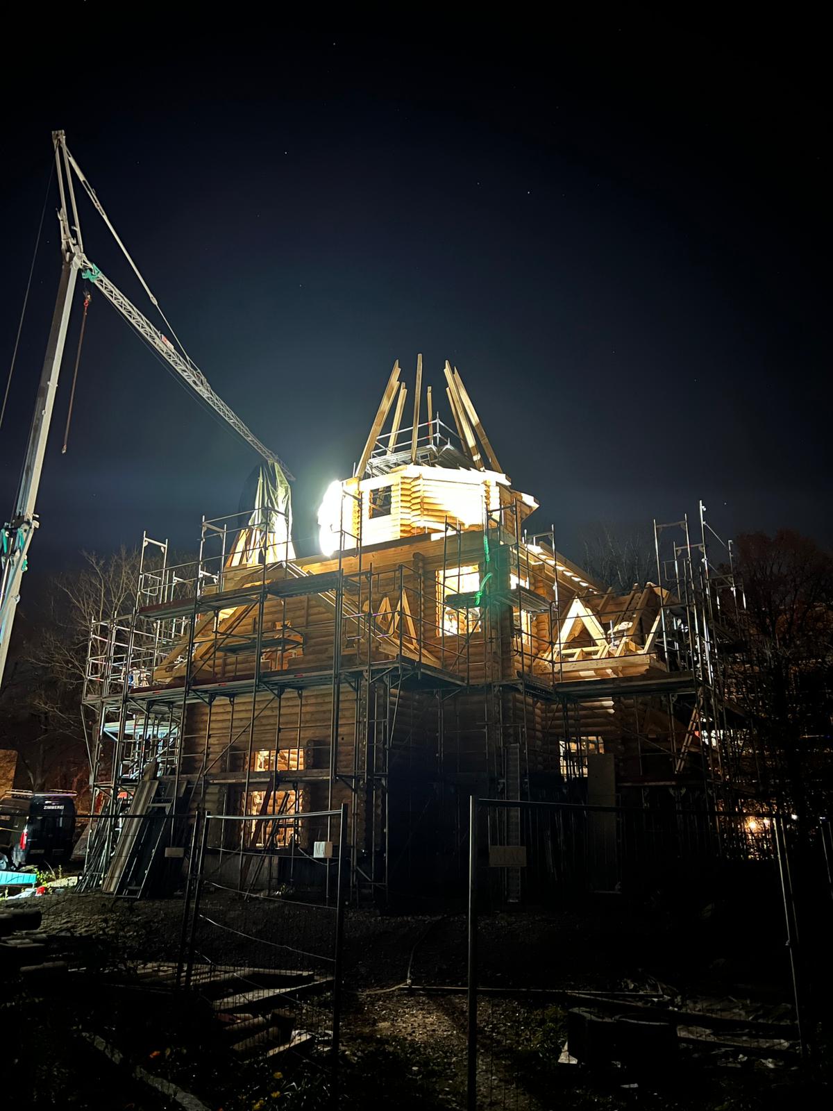 В октябре прошлого года на наш участок была доставлена последняя партия бруса, необходимая для возведения стен храма. На протяжении ряда месяцев велись консультации с компаниями, оказывающими плотницкие и кровельные услуги, по поводу крыши будущего храма. Из 8 компаний этого профиля лишь две оказались готовы взяться за изготовление такой достаточно сложной конструкции. Технологически возведение стен храма могло начаться лишь после заключения договора на плотницкие работы для крыши. Для начала этих работ требовалась гарантия их оплаты. Долго решался последний вопрос, связанный с устойчивостью стен. Разрешение на начало строительства храма было получено. Строительство активно ведётся.